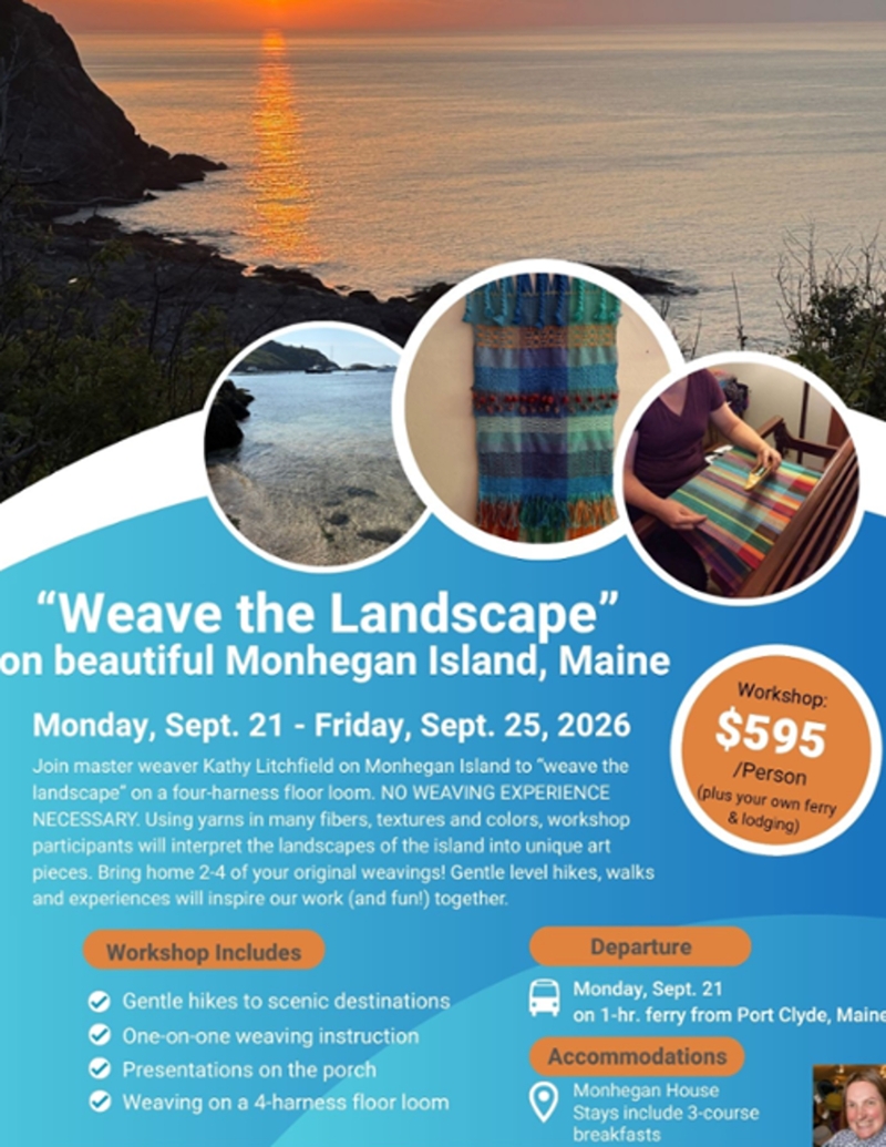 After our first super fun workshop last October, I'm leading the 2nd annual Monhegan Island "Weave the Landscape" workshop, teaching beginning weaving skills to anyone who's wanted to try weaving on a four harness floor loom, at this beautiful destination! I visited Monhegan Island with a great friend in June 2025 and fell in love with it. Join me for gentle hikes and to storytell with yarn, texture and color, to create pieces you can bring home. We'll have lots of fun and plenty of downtime for your own island explorations. For more info or to register, please call Kathy at (413) 522-0358 or email kathy@firecrowhandwovens.com. I'd love to hear from you!